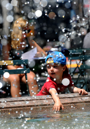 ▲7月19日,在美國紐約曼哈頓,一名男孩在噴泉邊戲水。當(dāng)日,紐約再度發(fā)布高溫預(yù)警,悶熱的天氣仍將持續(xù)。記者 申宏/紐約報(bào)道