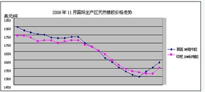 市場動態(tài):根據(jù)農(nóng)業(yè)部農(nóng)墾局監(jiān)測,2006年11份國外泰國三號煙片膠和印尼20號標(biāo)準(zhǔn)膠價格大幅回落,而國內(nèi)期貨、現(xiàn)貨價格也隨之節(jié)節(jié)下滑,成交量日漸萎縮,主產(chǎn)區(qū)云南全月幾乎沒有成交。 國外主產(chǎn)區(qū):泰國RSS3十一月平均價格為1659.5美元/噸,比上月下跌212.6美元/噸,最高價為1797.6美元/噸,最低價為1499美元/噸;印尼SIR20標(biāo)準(zhǔn)膠十一月平均價格為1646.8美元/噸,比上月平均價下跌207美元/噸,最高價為1745美元/噸,最低價為1517.5美元/噸;新加坡期貨市場的到期現(xiàn)貨月平均價格為1626美元/噸,最高價為1745美元/噸,最低價為1500美元/噸。