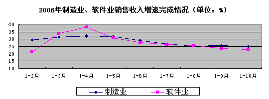 2.制造業(yè)發(fā)展速度快于軟件業(yè)。1-10月電子信息產(chǎn)業(yè)實(shí)現(xiàn)銷售收入增速24.8%,其中制造業(yè)增速為24.9%,略高于平均增速水平,特別是外商港澳臺(tái)投資企業(yè)增速達(dá)到25.5%;軟件業(yè)增速為23.0%,比上半年下降4.6個(gè)百分點(diǎn)。