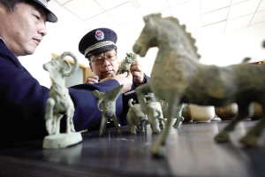 19日,城管隊員在清理暫扣的假古董。當天,兩名小販在西單惜薪胡同賣青銅酒杯等十多件“青銅文物”時,被西長安街城管查獲。小販承認,這些青銅器是河南一些小廠生產(chǎn)的“仿古”品,用鐵粉摻著銅銹綠以模壓制成,每個進價大約10元左右。