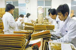 。玻埃埃纺暝┮詠(lái),北京感冒發(fā)燒病人持續(xù)上升,致使一些藥店的感冒藥供不應(yīng)求。1月9日,記者在北京中醫(yī)藥大學(xué)東直門醫(yī)院采訪時(shí)了解到,自上周六開(kāi)始,專家組開(kāi)出的處方“感冒一號(hào)”就供不應(yīng)求。不少患者從早晨等候到晚上也未能抓上藥。圖為該醫(yī)院中藥房忙碌的場(chǎng)面。