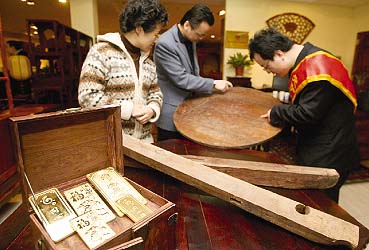 22日,北京紅木企業(yè)元亨利在紅木大觀樓擺出整盒的金條,征集散舊海南黃花梨木家什,只要通過專家鑒定是海南黃花梨木,哪怕是搟面杖、舊鍋蓋、瘸腿凳子都可換金子。1公斤黃花梨木最高能換40克黃金,價(jià)值約6800元。 工作人員介紹,按木料橫截面面積的大小,把木料分為3個(gè)等級(jí),最高等級(jí)的木料,1公斤約能換40克黃金,按照每克黃金170元計(jì)算,相當(dāng)于6800元。 元亨利總經(jīng)理?xiàng)畈ń榻B,自去年以來,紅木原料告急,價(jià)格翻番,每噸大料收購價(jià)高達(dá)上千萬元。公司數(shù)次去海南淘料都空手而歸,目前只能試試看在北京能不能收一些零散的黃花梨木料,如果收不上來,今后主產(chǎn)黃花梨家具的元亨利將面臨無米下鍋的境地。不過他提醒說:“不是啥木頭都能換,我只要海南黃花梨。”