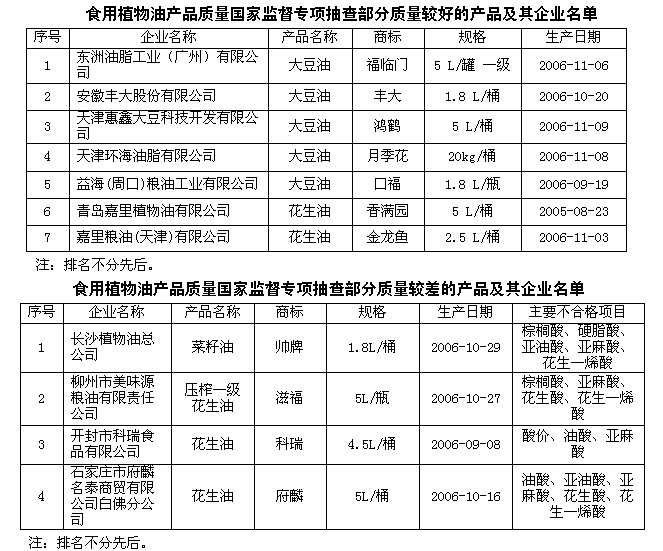 為了維護(hù)消費(fèi)者的合法權(quán)益,進(jìn)一步促進(jìn)食用植物油行業(yè)的健康發(fā)展,切實(shí)從源頭加強(qiáng)食用植物油質(zhì)量安全的監(jiān)督管理,春節(jié)前夕,國家質(zhì)檢總局組織對(duì)部分“年貨”食品進(jìn)行了國家監(jiān)督專項(xiàng)抽查。其中,食用植物油產(chǎn)品共抽查了北京、天津、河北、湖南、上海、江蘇、安徽、廣東、廣西、河南、山東等11個(gè)省、直轄市127家企業(yè)生產(chǎn)的140種產(chǎn)品,產(chǎn)品抽樣合格率為93.6%。自2002年開始實(shí)施食用植物油市場(chǎng)準(zhǔn)入制度以來,國家質(zhì)檢總局加強(qiáng)了對(duì)食用植物油加工企業(yè)的監(jiān)管,食用植物油的產(chǎn)品質(zhì)量比2002年提高了14.4個(gè)百分點(diǎn)。