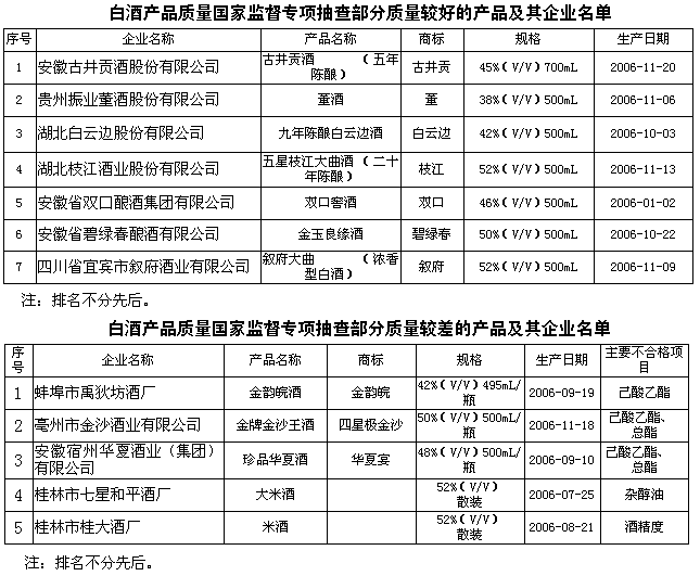 抽查結果表明:通過連續(xù)的國家監(jiān)督抽查,提升了企業(yè)質(zhì)量意識,使白酒產(chǎn)品質(zhì)量整體水平有所提高,大中型企業(yè)的產(chǎn)品質(zhì)量持續(xù)保持穩(wěn)定。