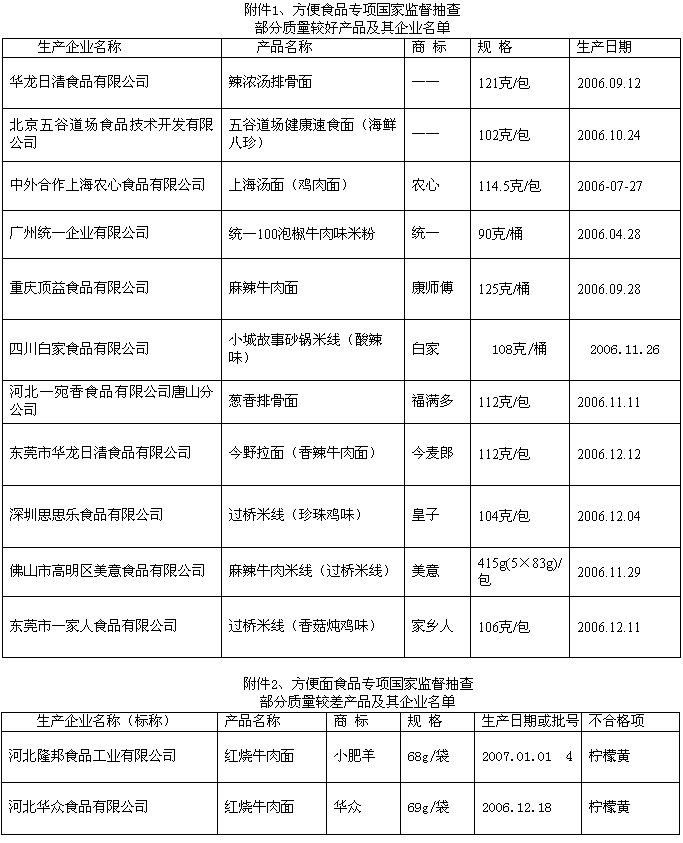 3月1日,國家質(zhì)檢總局發(fā)布了對方便面、方便米粉、方便米線等方便食品進行的專項國家監(jiān)督抽查結(jié)果。此次共抽查了北京、河北、上海、江蘇、福建、江西、山東、河南、廣東、重慶、四川、貴州等12個省、直轄市45家生產(chǎn)企業(yè)的63種產(chǎn)品,經(jīng)檢驗合格61種,抽樣合格率為96.8%。