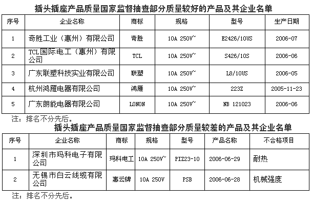 為保護(hù)消費(fèi)者的合法權(quán)益,促進(jìn)插頭插座行業(yè)的健康發(fā)展,國(guó)家質(zhì)檢總局對(duì)插頭插座產(chǎn)品質(zhì)量進(jìn)行了國(guó)家監(jiān)督抽查。共抽查了廣東、浙江、江蘇、四川、福建、上海等6個(gè)省、市46家企業(yè)生產(chǎn)的46種產(chǎn)品,產(chǎn)品抽樣合格率為80.4%。