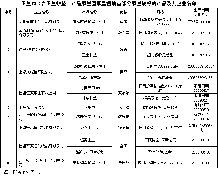 為了維護廣大消費者的合法權(quán)益,促進衛(wèi)生巾行業(yè)健康發(fā)展,國家質(zhì)檢總局組織對衛(wèi)生巾(含衛(wèi)生護墊)產(chǎn)品質(zhì)量進行了國家監(jiān)督抽查。共抽查了北京、天津、河北、江蘇、湖北、廣東、浙江、上海、福建等9個省市59家企業(yè)生產(chǎn)的73種產(chǎn)品,產(chǎn)品抽樣合格率為78.1%。