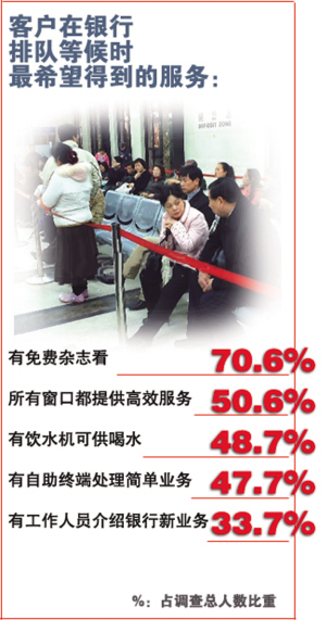 根據(jù)全天的觀察,記者發(fā)現(xiàn),各銀行業(yè)務(wù)量分配不均衡問題嚴(yán)重。記者在工行拿到的排號(hào)單上顯示“您排在0864號(hào)”,而其余銀行中,最多的也不到工行的一半。隨后,記者來(lái)到民生銀行和中信銀行,都只有一兩名客戶在辦理業(yè)務(wù)。業(yè)務(wù)量的不均衡,確實(shí)是造成四大行排長(zhǎng)隊(duì)的一個(gè)主要原因。 但有關(guān)人士認(rèn)為,業(yè)務(wù)量大并不是效率低和服務(wù)差的理由。對(duì)公窗口辦不了對(duì)私業(yè)務(wù),沒有綜合經(jīng)營(yíng);無(wú)論客戶人數(shù)是多是少,柜員人數(shù)不變,沒有彈性排班……銀行的管理,還有很大的改進(jìn)余地。 |