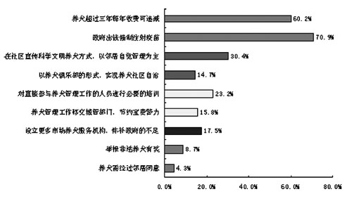 綜上所述,居民不愿意給寵物犬登記,相當一部分原因是出于對目前管理制度有些看法。調(diào)查發(fā)現(xiàn),居民贊同的寵物犬管理辦法中,免費強制注射疫苗、養(yǎng)犬超過3年且每年收費遞減,是提及率最高的兩個,分別為70.9%和60.2%。這再一次強調(diào)了居民“降低收費、獲得服務(wù)”的愿望。 值得注意的是,居民對養(yǎng)犬自治(鄰居自覺管理、養(yǎng)犬俱樂部)、政府管理優(yōu)化(工作人員培訓(xùn)、管理工作移交城管)都表現(xiàn)出了較大的熱情,同時他們還希望通過市場機制獲得更好的養(yǎng)犬服務(wù)。 寵物犬管理是城市管理工作中的一個難點,各個城市和國家均要根據(jù)自己的情況出臺各有特色的管理辦法。在狗身上植入“電子身份證”是目前寵物犬管理中的一項先進管理技術(shù),但不論技術(shù)多先進,最首要的事還是促使居民能夠主動為寵物上戶口,只有將寵物犬納入規(guī)范管理軌道,其他相應(yīng)的管理措施才能成行。因此,如何提高養(yǎng)犬居民的注冊意識,才是各城市制定和調(diào)整養(yǎng)犬政策時應(yīng)當首先考慮的。 寵物犬上戶口后期望應(yīng)享的權(quán)益和服務(wù)