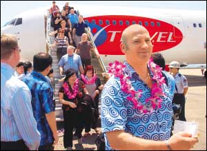 5月7日,英國著名旅游企業(yè)Mytravel集團(tuán)的一架飛機(jī)抵達(dá)海南三亞鳳凰國際機(jī)場,實(shí)現(xiàn)了英國曼徹斯特至三亞旅游包機(jī)的首航,100余名英國游客開始了在三亞的度假之旅。這條航線將延續(xù)至今年10月,每周執(zhí)飛1個(gè)往返航班。