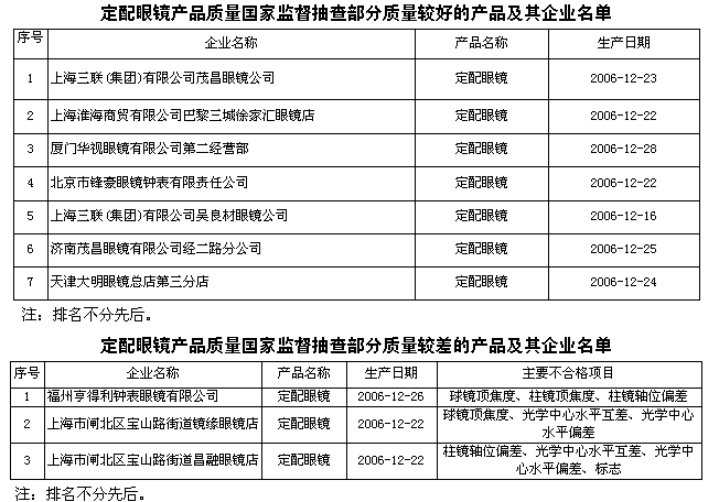 為維護(hù)消費(fèi)者的合法權(quán)益,促進(jìn)定配眼鏡行業(yè)健康發(fā)展,國(guó)家質(zhì)檢總局組織對(duì)定配眼鏡產(chǎn)品質(zhì)量進(jìn)行了國(guó)家監(jiān)督抽查。共抽查了北京、天津、上海、江蘇、河南、福建、山東等7個(gè)省、直轄市99家生產(chǎn)企業(yè)的99種產(chǎn)品,產(chǎn)品抽樣合格率為86.9%。自2000年起已連續(xù)8次對(duì)定配眼鏡產(chǎn)品質(zhì)量進(jìn)行了跟蹤抽查,促進(jìn)了產(chǎn)品質(zhì)量的不斷提高。