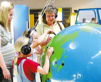 5月27日,在芬蘭首都赫爾辛基市附近的赫尤里卡科學(xué)中心主展廳的地球儀旁,芬蘭兒童頭帶耳機,將耳機插頭插在地球儀不同的地區(qū),可以聽到世界各地60種語言的問候。赫尤里卡科學(xué)中心是一個深受芬蘭兒童歡迎的科技館。它通過其設(shè)計新穎、富有哲理的展品對兒童進行深入淺出、寓教于樂的科普教育,激發(fā)他們對科學(xué)的興趣。