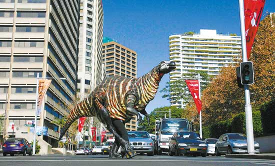 5月31日,在澳大利亞悉尼,“恐龍模特”在鬧市區(qū)穿行。當(dāng)天,一名工作人員身著3米長(zhǎng)的造型服裝,裝扮成橡樹(shù)龍走上街頭,為澳大利亞博物館新推出的戲劇節(jié)目《岡瓦納》宣傳造勢(shì)。橡樹(shù)龍是一種生活在侏羅紀(jì)晚期的食草類恐龍。