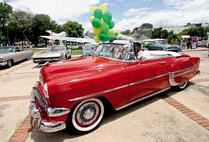 6月3日,一輛紅色老爺車在委內(nèi)瑞拉的馬拉凱市展出。委內(nèi)瑞拉文化部主辦的第一屆國際收藏和古董博覽會(huì)當(dāng)天在馬拉凱開幕,博覽會(huì)上舉行了老爺車和老照片展覽等活動(dòng)。新華社發(fā)