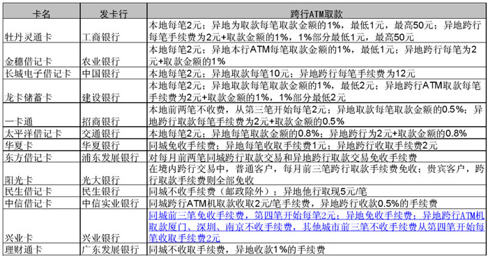 2500元,只要花4次取款,而異地跨行ATM機(jī)取款每筆手續(xù)費(fèi)為12元,那么手續(xù)費(fèi)為12×4=48元,節(jié)省了22元。 5月央行提高ATM機(jī)日提款上限到2萬元本來是為減少排隊、方便取款,持卡人在實際操作中卻發(fā)現(xiàn),如果是本地跨行取款2萬元要付出20元的手續(xù)費(fèi)。其實不同的銀行,ATM機(jī)取款額度有所不同。用銀行卡在ATM機(jī)上取款時,無論哪家銀行當(dāng)日累計的取款金額是5000元還是2萬元,但每次單筆最多能取的額度也是不一樣的。 在北京工作的李女士是建行龍卡借記卡的持卡人。李女士在中國銀行的ATM機(jī)上取款時卻發(fā)現(xiàn),每次最多只能取2000元,取滿2萬元不僅需要反復(fù)操作10次,還要付出高達(dá)20元的手續(xù)費(fèi)。李女士認(rèn)為,銀行應(yīng)將單筆提款的額度提高,這樣可以少取幾次,總的手續(xù)費(fèi)就可以降下來。李女士的看法代表了相當(dāng)一部分持卡人的聲音。 但目前跨行取款大多數(shù)銀行都是要收取手續(xù)費(fèi)的,取款人要想省下跨行的手續(xù)費(fèi),只能選擇每筆較高額度的ATM機(jī),減少跨行的手續(xù)費(fèi)用。特別是當(dāng)需要一次取出大量現(xiàn)金,又有不同銀行的兩至三個ATM機(jī)可以選擇時,應(yīng)該遵循以下兩個原則:一、要選發(fā)卡行的ATM機(jī);二、如果沒有發(fā)卡行的ATM機(jī),要選擇單筆取款金額比較多的銀行。 一般銀行都沒有對跨行取款的單筆限額單獨設(shè)限。本行的ATM機(jī)對本行卡與他行卡一視同仁,但當(dāng)他行卡的單筆取現(xiàn)額度低于本行卡時,以他行卡的限額為準(zhǔn)。以工商銀行為例,其ATM取款機(jī)單筆取現(xiàn)的最高額度是3000元。但建設(shè)銀行的銀行卡單筆取現(xiàn)額度是2000元,當(dāng)它在工商銀行ATM取款機(jī)上取款時,每次最多只能取2000元。 此外,如果手中持有的銀行卡是浦發(fā)銀行、光大銀行、民生銀行和華夏銀行等銀行發(fā)售的,跨行取款有一定的優(yōu)惠,它們有的同城跨行不收取手續(xù)費(fèi)或者異地跨行取款有2至3次的免手續(xù)費(fèi)機(jī)會,相對于其他銀行卡在ATM機(jī)取款,可節(jié)約一定的手續(xù)費(fèi)。(見下表)