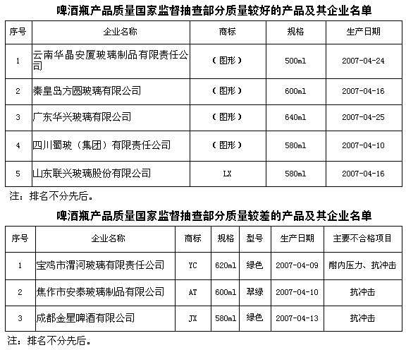 為維護(hù)廣大消費者的合法權(quán)益,促進(jìn)啤酒瓶行業(yè)健康發(fā)展,國家質(zhì)檢總局組織對啤酒瓶產(chǎn)品質(zhì)量進(jìn)行了國家監(jiān)督抽查。共抽查了河北、山西、吉林、黑龍江、上海、江蘇、浙江、安徽、福建、山東、河南、湖北、湖南、廣東、四川、重慶、云南、陜西、甘肅、寧夏、新疆等21個省、自治區(qū)、直轄市65家企業(yè)生產(chǎn)的65種產(chǎn)品(不涉及出口),產(chǎn)品抽樣合格率為86.2%。 此次抽查依據(jù)GB4544-1996《啤酒瓶》等國家標(biāo)準(zhǔn)進(jìn)行檢驗,主要包括理化指標(biāo)和標(biāo)志指標(biāo)。涉及的主要理化指標(biāo)為:內(nèi)應(yīng)力、抗沖擊、耐內(nèi)壓力和垂直軸偏差。標(biāo)志指標(biāo)主要是為防止不耐壓的非啤酒專用瓶用來灌裝啤酒,國家標(biāo)準(zhǔn)規(guī)定在瓶底以上20mm范圍打有啤酒瓶專用標(biāo)記“B”和生產(chǎn)企業(yè)的標(biāo)記,生產(chǎn)的年、季。經(jīng)檢驗,標(biāo)志指標(biāo)項目全部合格,部分產(chǎn)品理化指標(biāo)中的抗沖擊和耐內(nèi)壓力不合格。 抽查結(jié)果表明,一是連續(xù)的國家監(jiān)督抽查促進(jìn)了企業(yè)質(zhì)量意識的提高,加強了質(zhì)量管理,使啤酒瓶產(chǎn)品質(zhì)量水平比上次抽樣合格率提高了13.6個百分點;二是市場占有率較高的大中型企業(yè)產(chǎn)品質(zhì)量較好,具有先進(jìn)的生產(chǎn)工藝和嚴(yán)格的質(zhì)量管理;三是部分小型生產(chǎn)企業(yè)的產(chǎn)品質(zhì)量問題較多。 抽查中發(fā)現(xiàn)的主要質(zhì)量問題: 1、部分啤酒瓶抗沖擊力能力達(dá)不到國家標(biāo)準(zhǔn)規(guī)定的要求,抗沖擊力能力差的啤酒瓶在罐裝啤酒后,受到某種外力作用時,可能會發(fā)生啤酒瓶爆炸。 2、部分啤酒瓶耐內(nèi)壓力達(dá)不到國家標(biāo)準(zhǔn)規(guī)定的要求。耐內(nèi)壓力差的啤酒瓶在盛裝啤酒后,在生產(chǎn)、運輸和使用過程中,會因輕微碰撞而引起爆炸,也有可能發(fā)生自爆。