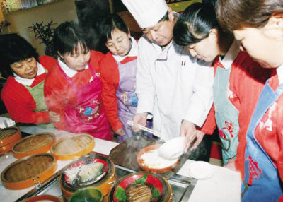據民政部門家政服務中心介紹,今年“金豬寶寶”扎堆,月嫂吃香,而寶寶家庭對月嫂業(yè)務能力要求普遍提高,不僅要求能干,還要求技術科學,例如最基本的做飯,家庭除要求可口之外,更多提出要保證營養(yǎng)。圖為月嫂在專業(yè)蒸菜大廚的指導下學習蒸菜烹飪。 |