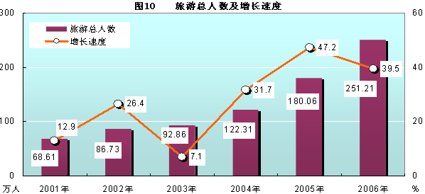 全年接待國內(nèi)外旅游者251.21萬人次,比上年增長39.5%。其中:接待國內(nèi)旅游者235.73萬人次,增長40.4%;接待海外旅游人數(shù)15.48萬人次,增長27.6%。全年實(shí)現(xiàn)旅游總收入27.71億元,比上年增長43.2%。實(shí)現(xiàn)外匯收入6094萬美元,比上年增長37.1%。