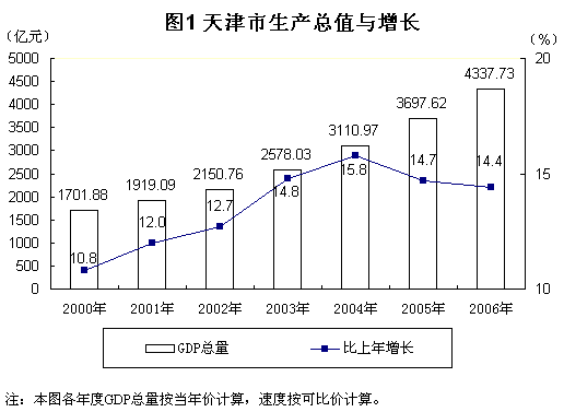2006年是“十一五”發(fā)展的第一年。全市人民在市委、市政府的正確領(lǐng)導(dǎo)下,以鄧小平理論和“三個(gè)代表”重要思想為指導(dǎo),以科學(xué)發(fā)展觀為統(tǒng)領(lǐng),認(rèn)真貫徹落實(shí)黨中央、國(guó)務(wù)院關(guān)于加快推進(jìn)濱海新區(qū)開(kāi)發(fā)開(kāi)放的決定和各項(xiàng)部署,扎實(shí)推進(jìn)“三步走”戰(zhàn)略和五大戰(zhàn)略舉措,加快經(jīng)濟(jì)增長(zhǎng)方式轉(zhuǎn)變,全面推進(jìn)和諧天津建設(shè),全市經(jīng)濟(jì)平穩(wěn)快速增長(zhǎng),效益質(zhì)量進(jìn)一步提高,各項(xiàng)社會(huì)事業(yè)全面發(fā)展,人民生活水平繼續(xù)提高,實(shí)現(xiàn)了“十一五”良好開(kāi)局。