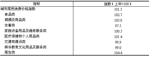 格 城市居民消費(fèi)價(jià)格指數(shù)為101.5,即比上年上漲1.5%。八大類價(jià)格呈現(xiàn)五升三降格局(見(jiàn)表1)。