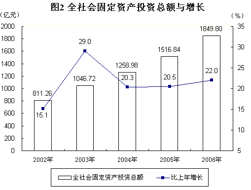 城市商品零售價(jià)格指數(shù)為100.4。工業(yè)品出廠價(jià)格指數(shù)為100.6。原材料燃料及動(dòng)力購(gòu)進(jìn)價(jià)格指數(shù)為104.7。房屋銷售價(jià)格指數(shù)為106.7,其中商品住宅價(jià)格指數(shù)為107.1。 固定資產(chǎn)投資 全社會(huì)固定資產(chǎn)投資完成1849.80億元,比上年增長(zhǎng)22.0%(見(jiàn)圖2)。其中,城鎮(zhèn)固定資產(chǎn)投資1709.66億元,增長(zhǎng)23.4%;農(nóng)村固定資產(chǎn)投資140.14億元,增長(zhǎng)6.9%。