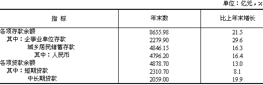 財政收入繼續(xù)強勢增長。全年全省完成財政總收入1048.0億元,一般預算收入583.1億元,分別比上年增長38.2%和58.3%。扣除資源探礦權(quán)、采礦權(quán)收入,財政總收入和一般預算收入分別為887.3億元和422.4億元,同口徑增長20.3%和21.4%。增值稅、營業(yè)稅、資源稅、企業(yè)所得稅和個人所得稅五大稅種共計完成稅收281.8億元,分別增長15.7%、22.7%、12.3%、41.7%和14.8%,增收49.6億元,占到財政總收入增量的33.2%。 財政支出結(jié)構(gòu)進一步優(yōu)化。一般預算支出執(zhí)行912.0億元,比上年增長36.4%。其中基本建設支出增長7.9%,水利和氣象支出增長17.3%,科學支出增長18.0%,教育支出增長17.7%,醫(yī)療衛(wèi)生支出增長25.0%,撫恤和社會福利救濟費支出增長22.7%,城市居民最低生活保障支出增長17.8%,公檢法司支出增長23.4%,文體廣播事業(yè)費增長21.7%。 年末全省金融機構(gòu)本外幣各項存款余額8656.0億元,比年初增加1529.3億元,與上年相比,多增338.4億元,增長21.5%,增幅同比提高1.5個百分點。各項貸款余額4878.7億元,比年初增加564.3億元,比上年多增297.6億元,增長13.0%,增幅同比提高2.6個百分點。人民幣個人消費貸款171.2億元,下降27.9%,其中個人住房貸款106.7億元,下降28.4%。全年累計現(xiàn)金收入17964.3億元,累計現(xiàn)金支出18087.6億元,貨幣凈投放123.3億元,比上年多投放91.4億元。