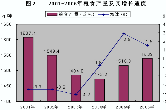 表2 2006年主要農(nóng)產(chǎn)品產(chǎn)量及其增長速度