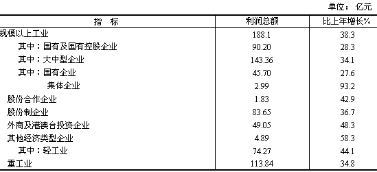 全年規(guī)模以上工業(yè)經(jīng)濟(jì)效益綜合指數(shù)180.2,提高23.1點(diǎn);主營業(yè)務(wù)收入3119.6億元,增長27.8%;利稅總額379.8億元,增長29.1%;盈虧相抵后實(shí)現(xiàn)利潤總額188.1億元,增長38.3%。