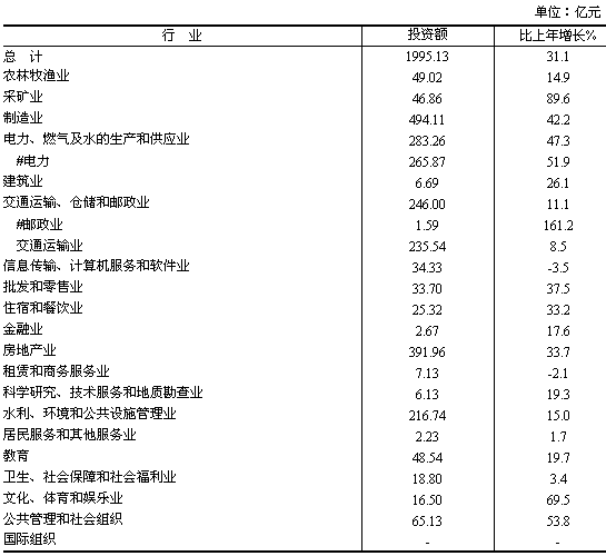 在城鎮(zhèn)固定資產(chǎn)投資中,從投資主體看,國有單位投資804.98億元,比上年增長13.7%;非國有單位投資1190.15億元,增長46.1%,其中民間投資1026.25億元,增長50.4%。從產(chǎn)業(yè)看,第一產(chǎn)業(yè)投資49.02億元,增長14.9%;第二產(chǎn)業(yè)投資830.92億元,增長45.8%,其中工業(yè)投資824.23億元,增長46.0%;第三產(chǎn)業(yè)投資1115.18億元,增長22.6%。