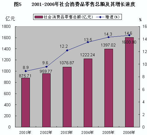 全年社會消費(fèi)品零售總額1600.8億元,比上年增長14.6%。分城鄉(xiāng)看,城市消費(fèi)品零售額943.8億元,增長15.2%;縣及縣以下消費(fèi)品零售額657.0億元,增長13.8%。分經(jīng)濟(jì)類型看,國有經(jīng)濟(jì)實(shí)現(xiàn)零售額101.94億元,增長10.2%;集體經(jīng)濟(jì)實(shí)現(xiàn)零售額54.74億元,增長12.8%;私營經(jīng)濟(jì)實(shí)現(xiàn)零售額158.68億元,增長20.2%;個體經(jīng)濟(jì)實(shí)現(xiàn)零售額1019.54億元,增長13.1%;聯(lián)營經(jīng)濟(jì)實(shí)現(xiàn)零售額2.19億元,增長40.5%;股份制經(jīng)濟(jì)實(shí)現(xiàn)零售額191.43億元,增長19.3%;外商投資經(jīng)濟(jì)實(shí)現(xiàn)零售額14.13億元,增長31.6%;港澳臺投資經(jīng)濟(jì)實(shí)現(xiàn)零售額2.91億元,增長1.44倍;其他經(jīng)濟(jì)實(shí)現(xiàn)零售額55.28億元,增長14.8%。分行業(yè)看,批發(fā)和零售業(yè)實(shí)現(xiàn)零售額1380.1億元,增長14.6%;住宿和餐飲業(yè)實(shí)現(xiàn)零售額192.3億元,增長16.1%。 從商品主要類別看,在限額以上批發(fā)零售貿(mào)易業(yè)中,石油及制品類零售額106.35億元,比上年增長43.5%;通訊器材類零售額7.41億元,下降21.0%;家用電器和音像器材類零售額26.23億元,下降6.8%;汽車類零售額84.22億元,增長17.2%;體育娛樂用品類增長10.4%;文化辦公用品類下降14.4%;家具類增長2.47倍;建筑及裝潢材料類增長4.14倍。