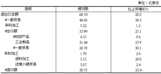 全年外貿(mào)進(jìn)出口總額 66.74億美元,增長28.8%。其中,出口35.99億美元,增長25.1%;進(jìn)口30.75億美元,增長33.4
