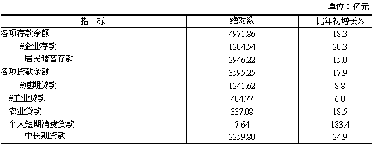 金融業(yè)增加值99.93億元,增長14.4%。 年末全部金融機(jī)構(gòu)存款余額4971.86億元,比年初增長18.3%;全部金融機(jī)構(gòu)貸款余額3595.25億元,比年初增長17.9%。