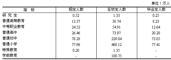 38.74萬人,畢業(yè)生8.23萬人。普通高中招生26.46萬人,在校生73.97 萬人,畢業(yè)生20.20萬人。普通小學(xué)招生