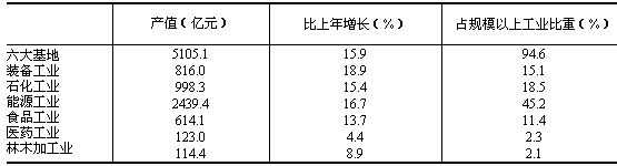 工業(yè)生產(chǎn)與效益同步較快增長。全年規(guī)模以上工業(yè)企業(yè)(全部國有及年產(chǎn)品銷售收入500萬元以上的非國有工業(yè)企業(yè))實現(xiàn)增加值2554.5億元,比上年增長15.2%,連續(xù)三年保持15%以上的增速。其中,國有及國有控股企業(yè)增加值2199.8億元,增長15.0%;集體企業(yè)增加值27.5億元,增長18.5%;股份制企業(yè)增加值2184.1億元,增長15.1%。從輕重工業(yè)看,輕工業(yè)增加值298.1億元,增長16.0%;重工業(yè)增加值2256.4億元,增長15.1%。從企業(yè)規(guī)模看,大中型企業(yè)增加值2300.9億元,增長15.1%;小型企業(yè)增加值253.6億元,增長16.4%。 全年規(guī)模以上工業(yè)企業(yè)實現(xiàn)利稅1733.2億元,比上年增長17.9%,其中利潤1275.9億元,增長19.5%。工業(yè)經(jīng)濟效益綜合指數(shù)348.9,提高12.2點。地方工業(yè)實現(xiàn)利稅209.2億元,增長19.1%,其中利潤92.6億元,增長42.3%。地方工業(yè)經(jīng)濟效益綜合指數(shù)128.2,提高16.1點。 六大基地支撐作用突出。全省裝備、石化、能源、食品、醫(yī)藥和林木加工等六大基地實現(xiàn)工業(yè)總產(chǎn)值5105.1億元,比上年增長15.9%,占規(guī)模以上工業(yè)的94.6%;實現(xiàn)利稅1703.5億元,增長17.6%,占規(guī)模以上工業(yè)的98.3%。六大基地產(chǎn)值如下: