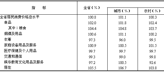 初步核算,全省實現(xiàn)生產(chǎn)總值7501.63億元,按可比價格計算,比上年增長13.4%。其中,第一產(chǎn)業(yè)增加值885.23億元,增長2.5%;第二產(chǎn)業(yè)增加值3736.08億元,增長17.0%;第三產(chǎn)業(yè)增加值2880.32億元,增長12.6%。人均地區(qū)生產(chǎn)總值21152元,比上年增長12.7%。 產(chǎn)業(yè)結(jié)構繼續(xù)調(diào)整。第一產(chǎn)業(yè)有所調(diào)減,第二產(chǎn)業(yè)繼續(xù)保持增勢,第三產(chǎn)業(yè)發(fā)展穩(wěn)定。三次產(chǎn)業(yè)比例由上年的12.8:48.7:38.5調(diào)整為11.8:49.8:38.4。 居民消費價格總水平比上年上漲0.8%(見表1),其中城市上漲1.1%,農(nóng)村上漲0.3%;消費品價格上漲1.2%,服務價格下降0.5%。工業(yè)品出廠價格下降0.8%。原材料燃料動力購進價格上漲3.9%。農(nóng)業(yè)生產(chǎn)資料價格上漲0.9%,比上年低7.2個百分點。