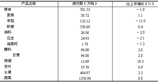全省農(nóng)林牧漁業(yè)完成總產(chǎn)值1473.41億元,比上年增長3.0%,增幅比上年回落1.7個百分點。 糧食種植面積2093.76萬畝,比上年減少68.18萬畝;煙葉種植面積103.69萬畝,增加3.52萬畝;蔬菜種植面積956.67萬畝,增加8.59萬畝;花卉種植面積15.86萬畝,增加0.74萬畝;油料種植面積182.21萬畝,減少1.38萬畝。糧食產(chǎn)量701.53萬噸,比上年減產(chǎn)1.9%;煙葉產(chǎn)量12.84萬噸,增產(chǎn)10.1%;油料產(chǎn)量26.86萬噸,減產(chǎn)2.0%;蔬菜產(chǎn)量1356.96萬噸,增產(chǎn)0.8%,水果產(chǎn)量494.97萬噸,增產(chǎn)3.3%(見表2)。