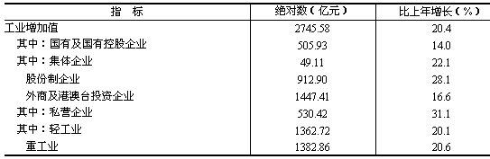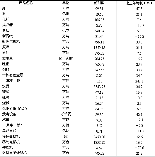 發(fā)電量904.25億千瓦小時,增長16.2%;原煤1759.18萬噸,增長21.1%。 黑色金屬冶煉及壓延加工業(yè)總產(chǎn)值比上年增長32.9%,非金屬礦物制品工業(yè)增長28.6%,化學原料及化學制品制造業(yè)增長13.5%,有色金屬冶煉及壓延加工業(yè)增長31.1%。主要原材料產(chǎn)品中,鋼材842.55萬噸,增長33.7%;粗鋼產(chǎn)量465.48萬噸,增長20.9%;水泥3343.93萬噸,增長24.9%;十種有色金屬增長34.2%,硫酸、純堿、燒堿等主要化工產(chǎn)品增長2.9%至16.7%。 通用設備制造業(yè)總產(chǎn)值比上年增長27.6%,電氣機械及器材制造業(yè)增長16.0%,交通運輸設備制造業(yè)增長24.8%。發(fā)電設備增長42.7%;汽車產(chǎn)量7.32萬輛,下降2.7%,其中轎車3.57萬輛,下降5.3%。 高技術產(chǎn)業(yè)總產(chǎn)值比上年增長26.4%。在高技術產(chǎn)業(yè)中,通信設備、計算機及其他電子設備制造業(yè)增長29.6%,其中彩色電視機、程控交換機、移動電話機、微型電子計算機等產(chǎn)品產(chǎn)量分別增長16.5%至166.9%(工業(yè)主要產(chǎn)品產(chǎn)量見表4)。