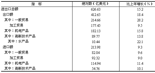 全省進出口總額626.63億美元,比上年增長15.2%。其中,出口412.65億美元,增長18.4%;進口213.98億美元,增長9.3%(見表7)。進出口相抵,順差198.67億美元,比上年增加45.94億美元。