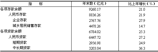 全省年末金融機構本外幣各項存款余額9260.17億元,比上年增長21.0%;全部金融機構本外幣各項貸款余額6784.02億元,增長25.3%(見表9)。 農(nóng)村合作金融機構人民幣貸款余額543.67億元,比上年末增加108.36億元。金融機構人民幣個人貸款余額1302.42億元,增長48.9%。