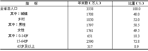 全省年末常住總?cè)丝?558萬人(見表10),凈增人口23萬人。出生人口42.56萬人,出生率12.00‰;死亡人口20.39萬人,死亡率5.75‰;自然增長率6.25‰。