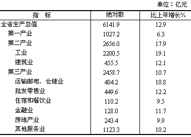 初步核算,全年生產(chǎn)總值(GDP)6141.9億元,按可比價(jià)格計(jì)算,比上年增長(zhǎng)12.9%。其中,第一產(chǎn)業(yè)增加值1027.2億元,增長(zhǎng)6.3%;第二產(chǎn)業(yè)增加值2656億元,增長(zhǎng)17.9%;第三產(chǎn)業(yè)增加值2458.7億元,增長(zhǎng)10.7%。三次產(chǎn)業(yè)結(jié)構(gòu)為16.7∶43.3∶40。按常住人口計(jì)算,人均生產(chǎn)總值10044元,比上年增加1374元,首次突破萬(wàn)元大關(guān)。全社會(huì)勞動(dòng)生產(chǎn)率16576元/人,比上年增加1799元。