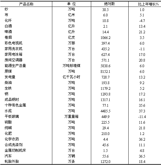 全省37個(gè)工業(yè)行業(yè)生產(chǎn)均保持增長(zhǎng),其中交通運(yùn)輸設(shè)備制造業(yè)增加值增長(zhǎng)35%,電氣機(jī)械及器材制造業(yè)增長(zhǎng)20.6%,有色金屬冶煉及壓延加工業(yè)增長(zhǎng)21.1%,食品制造業(yè)、飲料制造業(yè)分別增長(zhǎng)43.9%和48.4%,非金屬礦物制品業(yè)增長(zhǎng)30.1%,電力、熱力的生產(chǎn)和供應(yīng)業(yè)增長(zhǎng)13.8%。全年新產(chǎn)品產(chǎn)值500.5億元,增長(zhǎng)6.6%。主要工業(yè)產(chǎn)品產(chǎn)量中,原煤增長(zhǎng)6%,發(fā)電量增長(zhǎng)13.2%,鋼、成品鋼材分別增長(zhǎng)17.2%和16.1%,十種有色金屬增長(zhǎng)35.6%,汽車(chē)增長(zhǎng)36.5%,家用電冰箱、房間空調(diào)器分別增長(zhǎng)17%和20.8%。