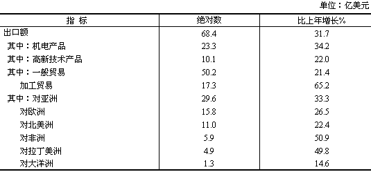 全年進(jìn)出口總額122.5億美元,比上年增長(zhǎng)34.3%。其中,出口68.4億美元,增長(zhǎng)31.7%;進(jìn)口54.1億美元,增長(zhǎng)37.7%。從出口商品看,機(jī)電產(chǎn)品增長(zhǎng)34.2%,占全部出口的比重由上年的33.4%提高到34%。從出口經(jīng)營(yíng)主體看,生產(chǎn)企業(yè)、外商投資企業(yè)增勢(shì)強(qiáng)勁,分別增長(zhǎng)45%和39.7%。