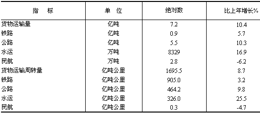 全年交通運(yùn)輸、倉(cāng)儲(chǔ)和郵電通信業(yè)實(shí)現(xiàn)增加值404.2億元,比上年增長(zhǎng)10.8%。 全年完成旅客運(yùn)輸量7.9億人,貨物運(yùn)輸量7.2億噸,分別比上年增長(zhǎng)8.6%和10.4%;旅客運(yùn)輸周轉(zhuǎn)量889.7億人公里,貨物運(yùn)輸周轉(zhuǎn)量1695.5億噸公里,分別增長(zhǎng)10.2%和8.7%。全年港口貨物吞吐量19998.9萬(wàn)噸,其中外貿(mào)貨物吞吐量211.5萬(wàn)噸。
