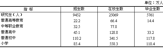 萬(wàn)人。普通高中786所,在校生128.8萬(wàn)人。普通初中3301所,在校生341.5萬(wàn)人。小學(xué)18204所,在校生558.3萬(wàn)人。初中階段適齡人口入學(xué)率為98.21%,小學(xué)學(xué)齡兒童入學(xué)率為99.72%。各級(jí)各類(lèi)成人學(xué)校畢業(yè)生數(shù)76.5萬(wàn)人。