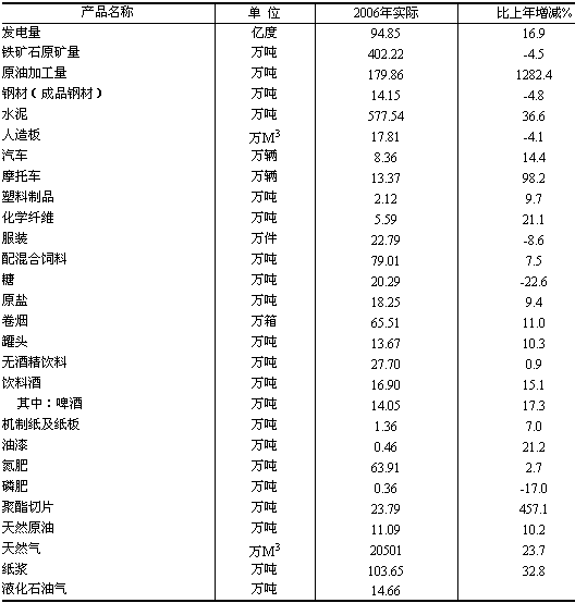 60萬噸甲醇、110萬噸鐵精粉、8萬噸本乙烯、15萬臺汽車發(fā)動機等一批大項目陸續(xù)投產(chǎn)并產(chǎn)生即期效益,石油加工、化肥、紙漿、汽車制造、制藥、旋窯水泥等新型工業(yè)成為工業(yè)經(jīng)濟新的增長亮點,有效地推動了工業(yè)經(jīng)濟快速發(fā)展。2006年,工業(yè)完成增加值217.55億元,比上年增長24.1%,增速提高了7.1個百分點,對經(jīng)濟增長貢獻率為33.6%,是全省經(jīng)濟增長的“火車頭”,占生產(chǎn)總值比重由上年的19.07%提高至20.67%,提高1.6個百分點。其中,規(guī)模以上工業(yè)完成增加值197.66億元,增長26.5%。在規(guī)模以上工業(yè)增加值中,國有控股企業(yè)完成增加值101.64億元,增長14.6%。分輕重工業(yè)看,重工業(yè)完成增加值137.85億元,增長36.8%;輕工業(yè)完成增加值59.81億元,增長11.4%。分經(jīng)濟類型看,國有企業(yè)完成增加值41.37億元,增長8.5%;集體企業(yè)完成增加值0.40億元,增長23.7%;股份合作企業(yè)完成增加值0.07億元,增長24.9%;股份制企業(yè)完成增加值79.16億元,增長9.3%;外商及港澳臺企業(yè)完成增加值70.19億元,增長66.7