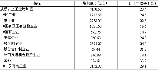 全年全部工業(yè)增加值6070.93億元,比上年增長18.7%,工業(yè)對(duì)經(jīng)濟(jì)增長的貢獻(xiàn)率為61.1%。其中,規(guī)模以上工業(yè)增加值4150.60億元,增長23.4%;產(chǎn)品銷售率98.5%,比上年提高0.1個(gè)百分點(diǎn)。