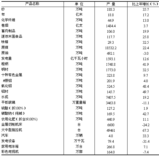 全省規(guī)模以上工業(yè)中,煤炭開采和洗選業(yè)實(shí)現(xiàn)增加值380.71億元,比上年增長20.6%;農(nóng)副食品加工業(yè)增加值270.72億元,增長25.1%;紡織業(yè)增加值147.31億元,增長21.3%;化學(xué)原料及化學(xué)制品制造業(yè)增加值230.08億元,增長26.8%;非金屬礦物制品業(yè)增加值391.45億元,增長26.9%;黑色金屬冶煉及壓延加工業(yè)增加值242.08億元,增長24.7%;有色金屬冶煉及壓延加工業(yè)增加值298.88億元,增長18.2%;通用設(shè)備制造業(yè)增加值150.78億元,增長27.9%;專用設(shè)備制造業(yè)增加值132.27億元,增長23.0%;電力、熱力的生產(chǎn)和供應(yīng)業(yè)增加值368.11億元,增長21.4%。 主要工業(yè)產(chǎn)品產(chǎn)量中,畜肉制品產(chǎn)量比上年增長19.9%,速凍米面食品增長25.8%,原煤增長22.4%,發(fā)電量增長12.6%,鋼材增長32.5%,鋁材增長49.7%,大中型拖拉機(jī)增長67.3%。