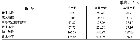 全年全省普通高等學(xué)校招生33.77萬人,在校生97.41萬人,畢業(yè)生20.21萬人。普通高中招生67.75萬人,在校生201.58萬人,畢業(yè)生57.36萬人。初中學(xué)校招生166.19萬人,在校生540.98萬人,畢業(yè)生188.06萬人。普通小學(xué)招生176.86萬人,在校生997.09萬人,畢業(yè)生166.71萬人。