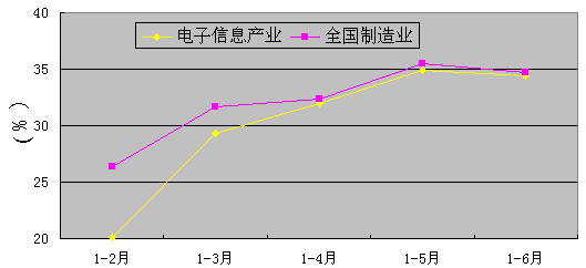 圖1 2007年1-6月電子信息產(chǎn)業(yè)與全國制造業(yè)累計(jì)完成投資增速對比情況(%)